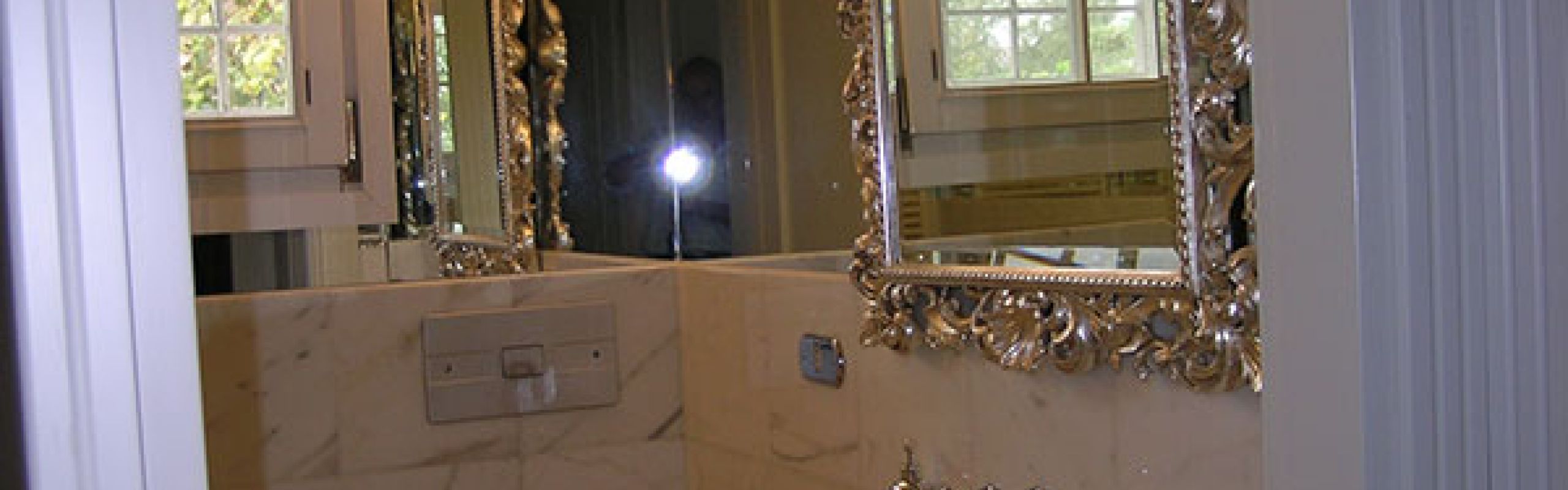 L'utilizzo di una Boiserie in specchio moltiplica lo spazio di questo piccolo servizio. La presenza del marmo cacacatta a pavimento e parete introduce il lavabo in marmo di Carrara ricavato da un'antica acquasantiera.